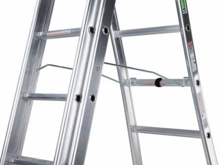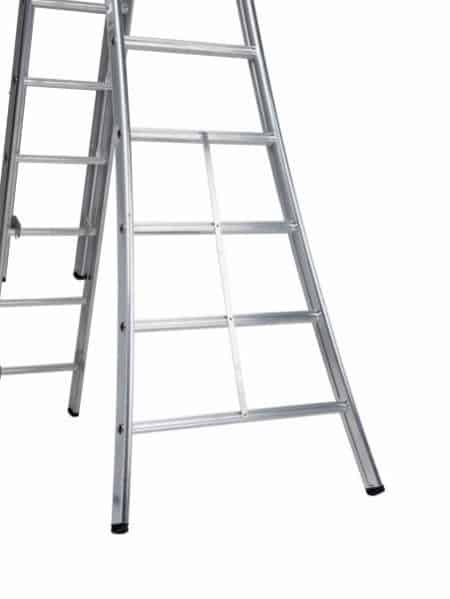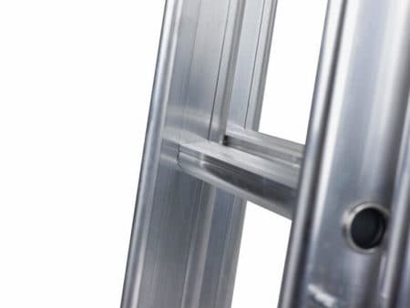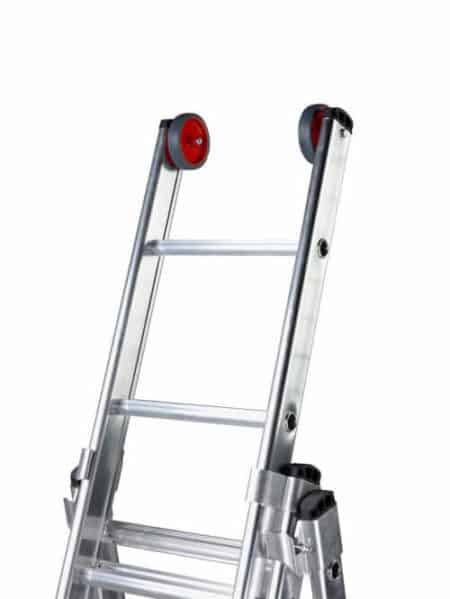 Die ALTREX Rocky Alu Mehrzweckleiter ist eine echte Profi-Leiter für große Arbeitshöhen. Daher gibt es diese Leiter auch nur in der Variante 3 x 10 Sprossen sowie in der Variante 3 x 12 Sprossen. Bei dieser Altrex Leiter sind nicht wie sonst üblich D-Sprossen verbaut, sondern hier hat der niederländische Hersteller auf Rundsprossen mit einer waagerechten Auftrittsfläche gesetzt. Die Auftrittsfläche misst 27mm. Das Besondere dieser Mehrzweckleiter ist die Bauform. Die Holme der Leiter verlaufen breit nach unten, so dass hier ein Stabilitätsbalken nicht erforderlich ist. Diese Form der Leiter wird häufig in den BENELUX-Staaten und Frankreich benutzt und gewinnt hier in Deutschland zunehmend an Interesse. Auch hier, wie bei jeder anderen Altrex Leiter auch, ist die letzte begehbare Sprosse rot lackiert. Diese rote Sprosse hat eine signalisierende Wirkung und sorgt so vielmehr für Sicherheit. Überdies sind auch Wandlaufrollen im Lieferumfang enthalten und bereits vormontiert.